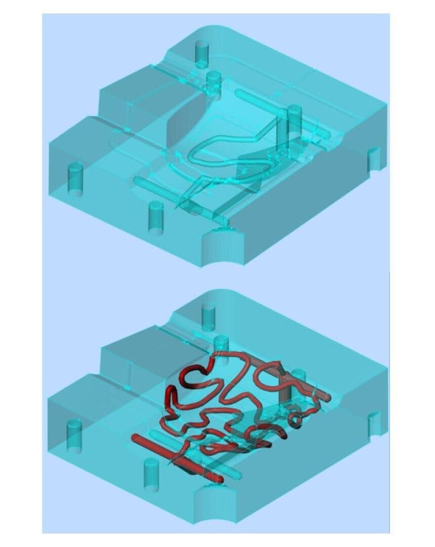 During a KTI-project, BSF Bünter AG has developped an innovative software tool, that automatically generates conformal cooling channels within a very short time (-90%). Flow and heat conduction are constantly simulated and the channels get optimized for the best possible results.